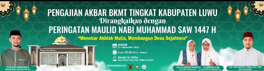 Nasionalinfo.Com, Luwu – Badan Kontak Majelis Taklim ( BKMT ) Kabupaten Luwu menggelar Pengajian Akbar yang di Rangkaikan dengan Maulid Nabi Muhammad SAW 1447 Hijriah, dengan mengangkat tema ” Menebar Akhlak Mulia, Membangun Desa Sejahtera “.