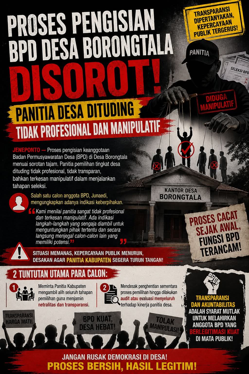 - Mendesak penghentian sementara proses pemilihan di Desa Borongtala hingga dilakukan audit atau evaluasi menyeluruh terhadap kinerja panitia desa.